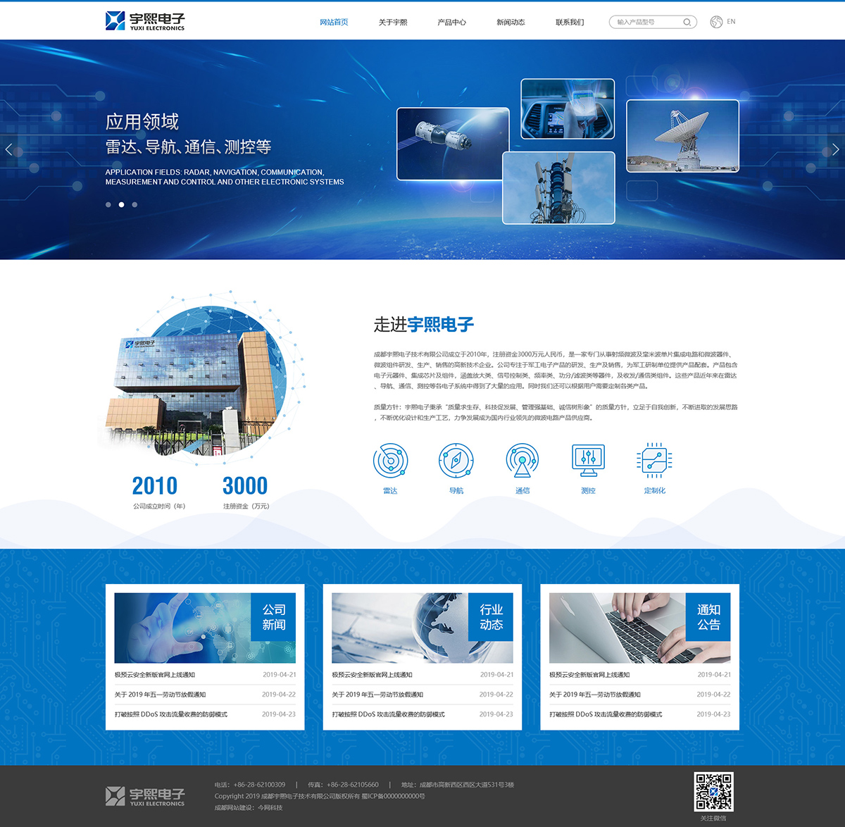 成都宇熙电子技术有限公司成立于2010年,注册资金3000万元人民币,是一家专门从事射频微波及毫米波单片集成电路和微波器件、微波组件研发、生产、销售的高新技术企业。公司现已通过质量体系认证和行业相关资格认证,并在成都高新西区拥有1800余平米的研发生产基地。