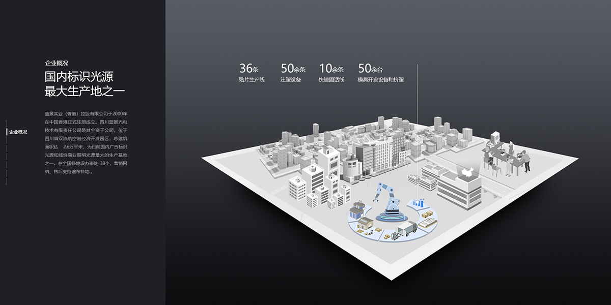 四川蓝景光电位于四川省双流航空港经济开发园区,总建筑面积达 4万平米,为目前国内广告标识光源和线性商业照明光源最大的生产基地之一。蓝景拥有业内独特的全产品链生产体系,覆盖从LED标识光源到照明灯具的全品类,在这里,您能找到智能照明整体解决方案。蓝景追求极致光体验,经过多年精研智作,开发出的高质量产品取得100余项专利,并荣获国家高新技术企业认证,四川省企业技术中心称号。