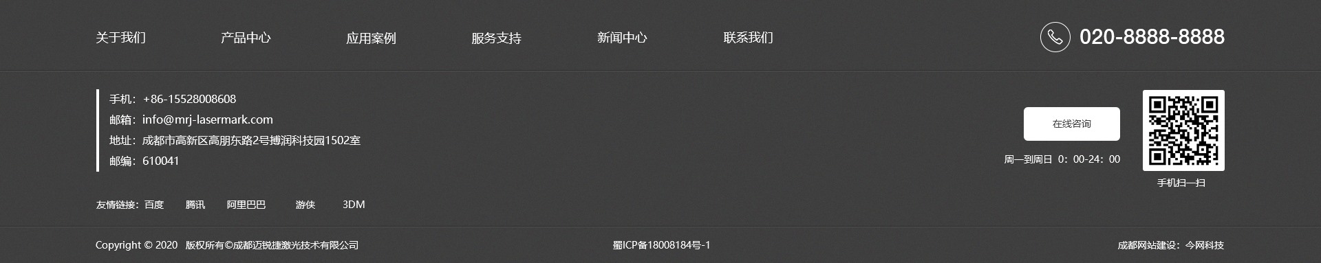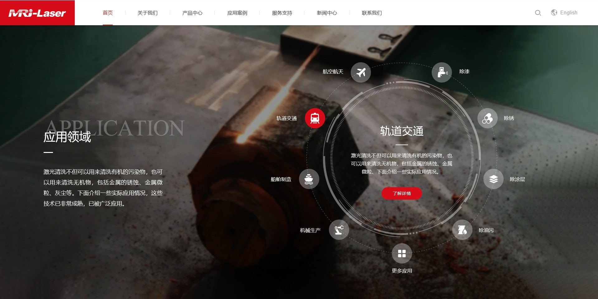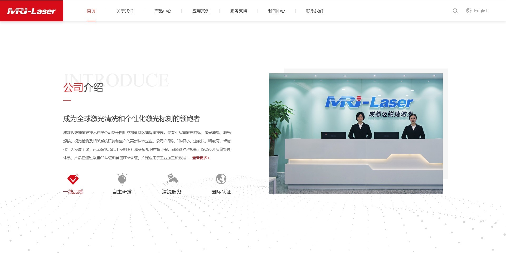 成都迈锐捷激光技术有限公司位于高新区搏润科技园,是专业从事激光清洗、激光打标、激光焊接、机器视觉及相关应用控制系统的研发、生产和销售于一体的高新技术企业。公司拥有光学、机械、电路控制和软件开发的核心研发团队,人才储备丰富,技术力量雄厚,竭诚为全球客户提供优质、高效的激光加工设备和全方位的应用解决方案,以满足不同工业加工领域的激光设备定制需求。